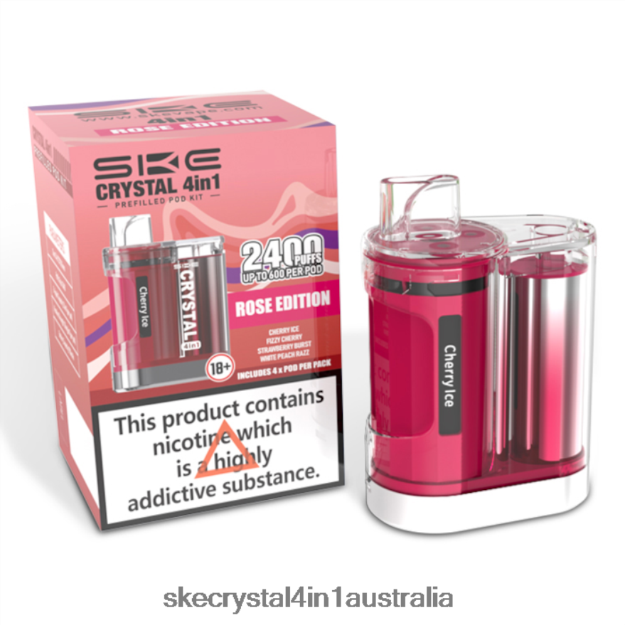 The Rose Edition SKE Crystal 2400 4-in-1 Pod Kit is an exciting TPD-compliant prefilled pod kit ideal for MTL (Mouth To Lung) vaping. With a rechargeable 950mAh internal battery and delivering up to 2400 puffs, this kit is perfect for all-day vaping. The kit comes with four pods and each pod provides up to 600 puffs and is prefilled with 2ml of Nicotine Salts containing 20mg of nicotine strength. With a choice of six kits with the same flavoured pods or four kits with different flavoured pods, there’s something for everyone.